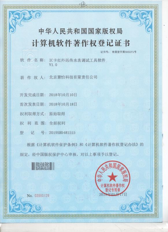 祝贺慧怡科技IC卡红外远传水表调试工具软件获得专利批准,由中华人民共和国国家版权局授予颁发,慧怡将再接再厉。