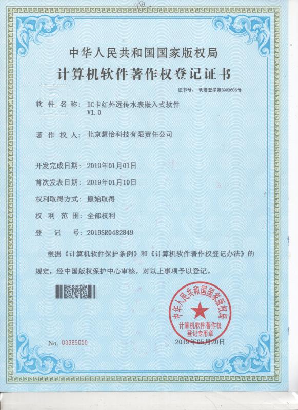 祝贺慧怡科技IC卡红外远传水表嵌入式软件VL.0获得专利批准,由中华人民共和国国家版权局授予颁发,慧怡将再接再厉。