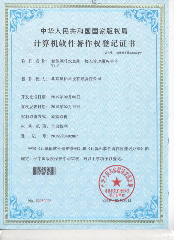 祝贺慧怡科技智能远传水表统一接入管理服务平台VL.0获得专利批准,由中华人民共和国国家版权局授予颁发,慧怡将再接再厉。